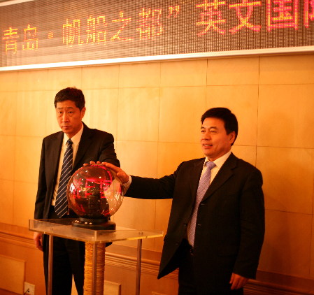 Wang Ximin, Vice Editor Chief of China Daily, and Wang Wei,Director of the Publicity Bureau of Qingdao Municipal Government, press the openning button together. (by Ju Chuanjiang) |