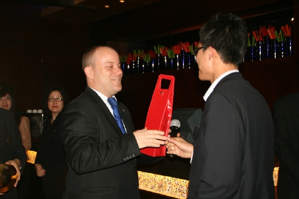 Chris Roberts (L), General Manager of DoubleTree by Hilton Qingdao -Chengyang, grants an award to a door prize winner at the Rebirth Party |